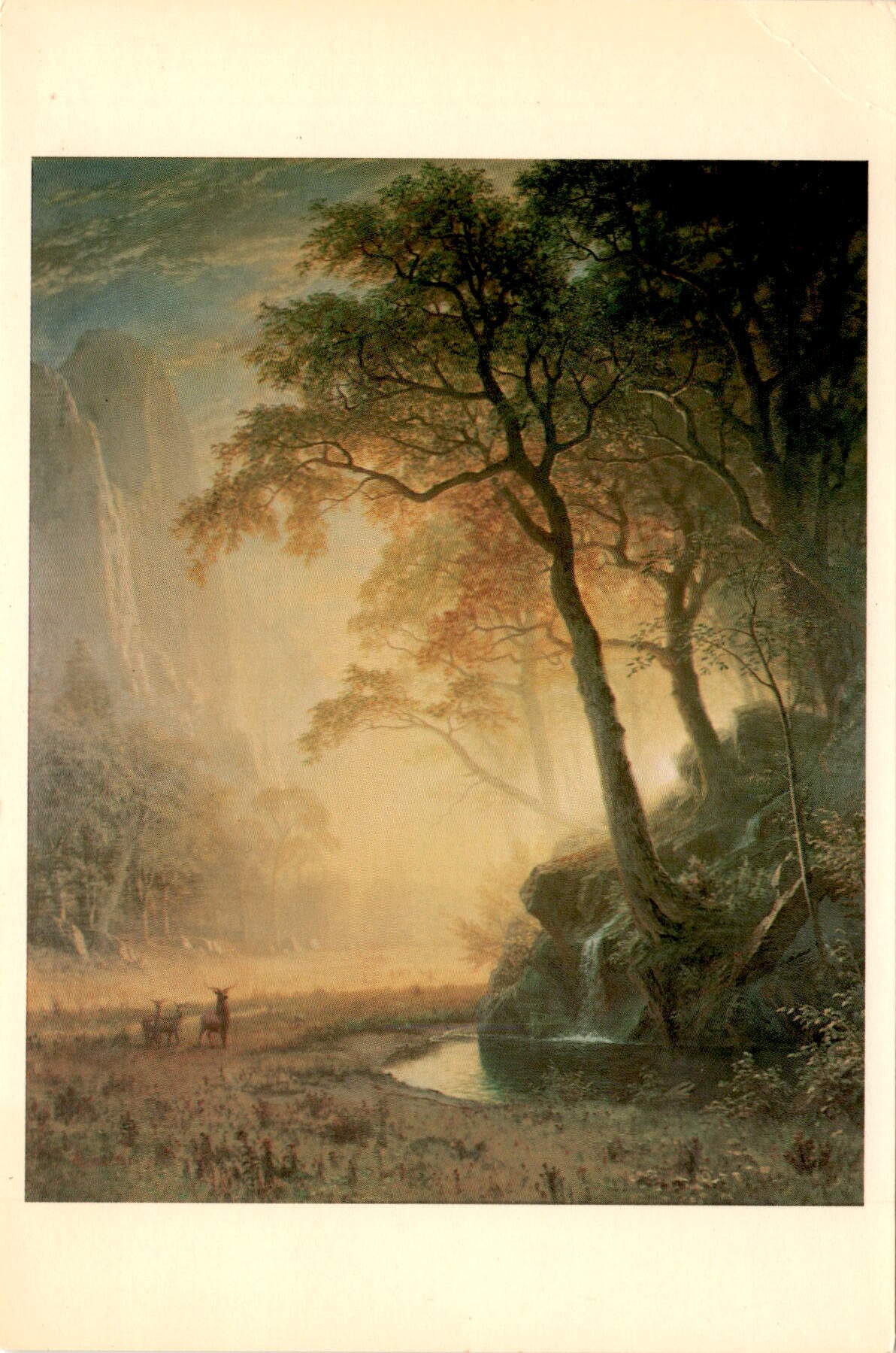 The postcard features a painting by Albert Bierstadt titled Hetch Hetchy Cañon, created around 1876. The artwork is an oil on canvas piece measuring 51 x 42 and is housed at the Mount Holyoke College Art Museum in South Hadley, Massachusetts. Albert Bierstadt was a renowned 19th-century American landscape painter known for his detailed and majestic portrayals of the American West. The Hetch Hetchy Canyon is located in Yosemite National Park in California and is known for its natural beauty and stunning landscapes.