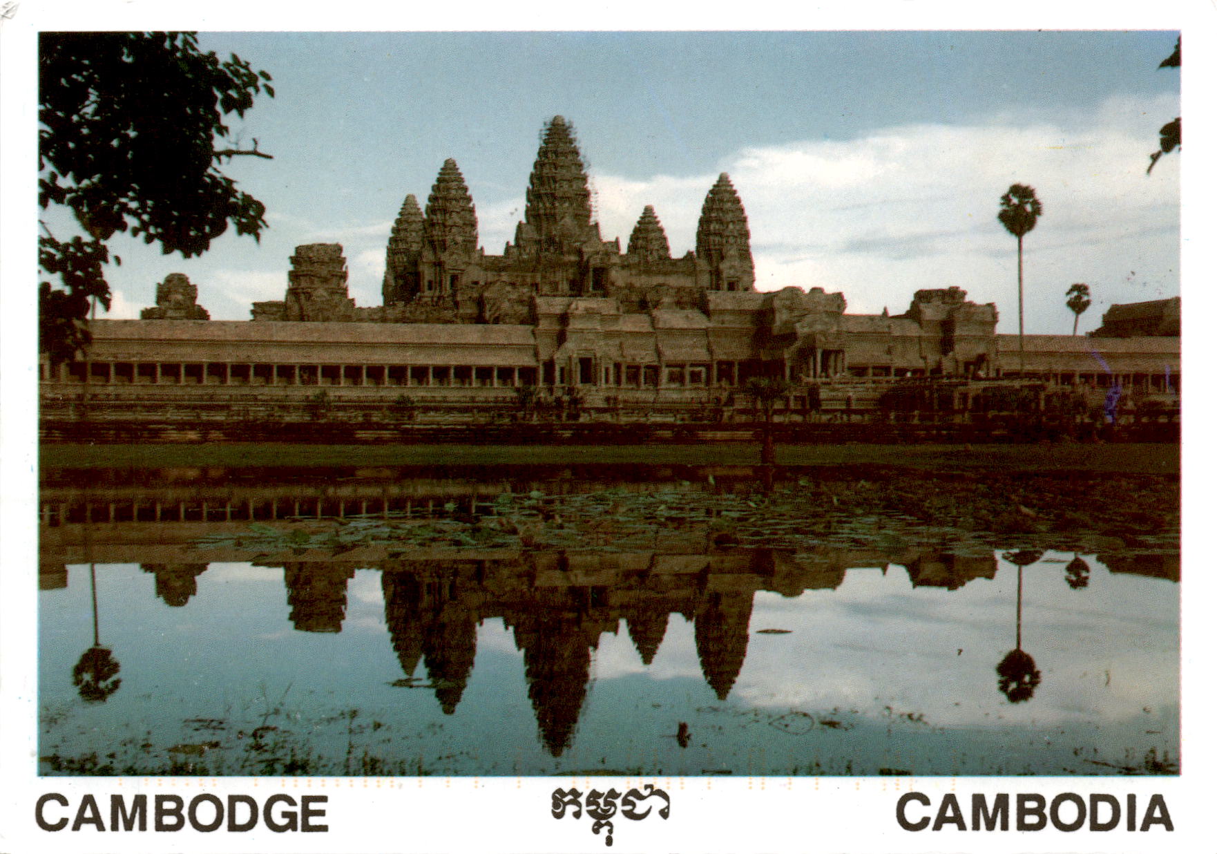 The postcard features a photo of Angkor Wat in Siem Reap, Cambodia, with a reflection in a holy pond. The sender, Brum & Marilyn, mention flooding in the area and their travels to Vietnam and Japan. The postcard also commemorates the 30th anniversary of the Great Victory Day in Cambodia, marking the end of the Khmer Rouge regime in 1979. The sender’s address is in Pittsburgh, USA. Angkor Wat is a famous temple complex and a UNESCO World Heritage site known for its intricate architecture and historical significance.