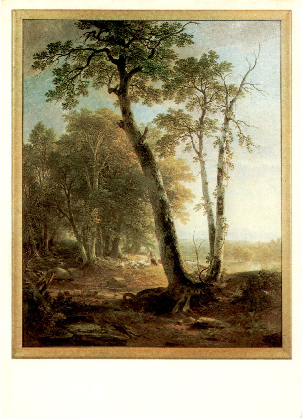 The postcard features the painting In the Woods by Asher Brown Durand, a prominent American artist from the 19th century. The painting was purchased by a museum and is associated with the Fine Arts program at Amherst College. Durand was a leading figure in the Hudson River School of landscape painting, known for his detailed and realistic portrayals of American scenery. In the Woods likely showcases his skill in capturing the beauty of nature. The photograph on the postcard was taken by Blaine K. Rawdon, an alum from Amherst College.