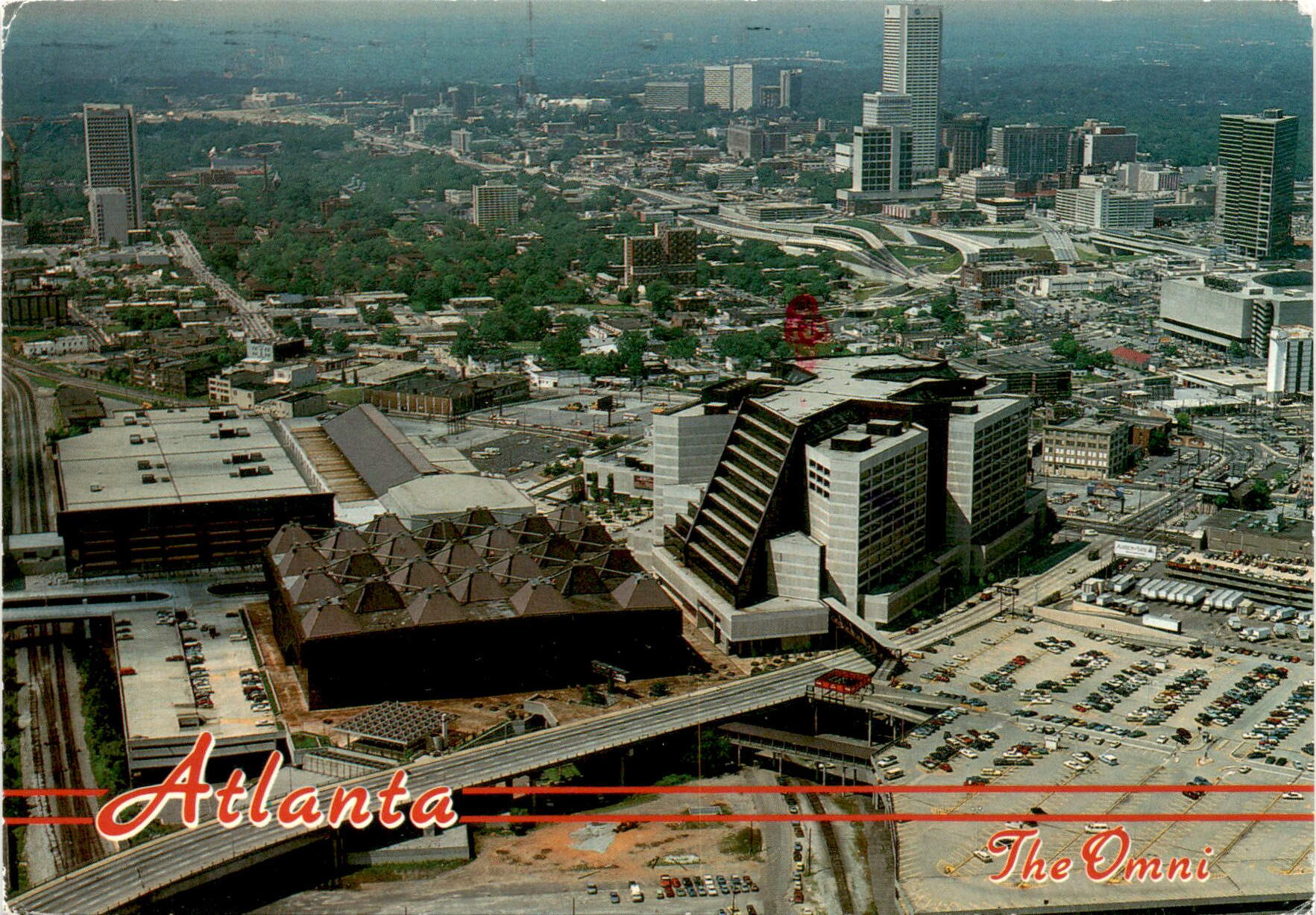 The postcard features an aerial view of Atlanta, Georgia, showcasing the Omni Sports Complex in the center. Atlanta is known as the metropolitan capital of the South, a major city with a rich history and cultural significance. The Omni Sports Complex was a prominent venue in Atlanta, hosting various sporting events and concerts. The postcard is dated July 18, 1988, and was sent by Fran to someone named Wendell Holmes. The postcard was produced by GA Scenic South Co. and printed in Ireland using Plastichrome technology.