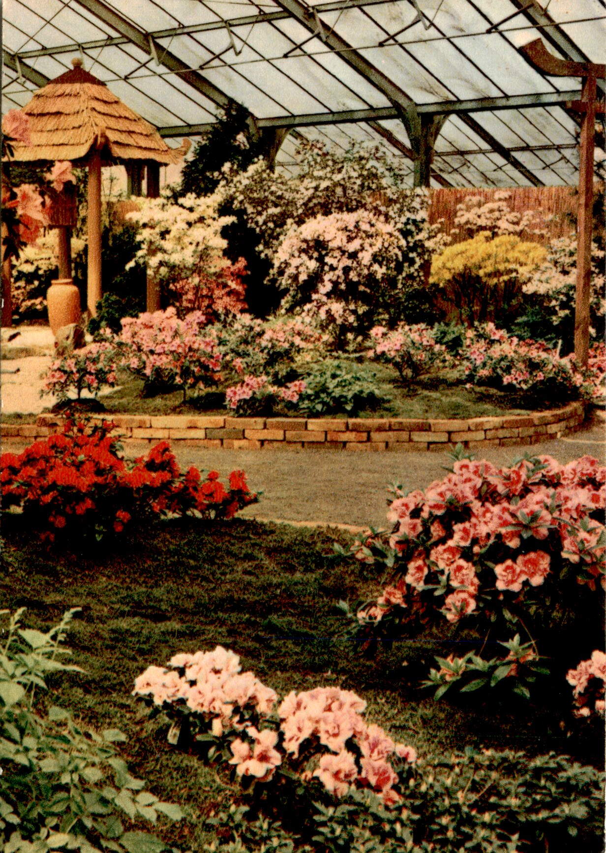 The postcard features an image of the Azalea exhibition hall in Palmengarten, Frankfurt am Main. Palmengarten is a large botanical garden in Frankfurt, Germany, known for its diverse collection of plants and flowers. The Azaleenschau exhibition hall showcases a variety of azaleas, a type of flowering shrub known for their vibrant colors. The postcard was printed by K. Haase in Frankfurt using copperplate printing, a technique that produces high-quality prints. The postcard was distributed by H. Osterwald in Hannover.
