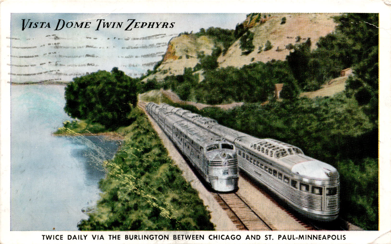 The postcard advertises the Vista Dome Twin Zephyrs train service by Burlington, running between Chicago and St. Paul-Minneapolis with scenic views of the Mississippi River. The new diesel-powered, stainless steel trains feature reclining chair coaches, parlor cars, dining cars, and club-lounges. The postcard is dated May 28, 1949, and mentions a visit to Roann, with a note about the weather and family updates. The postcard is addressed to Albin in Cashmere, Washington, with a postmark from the United States.