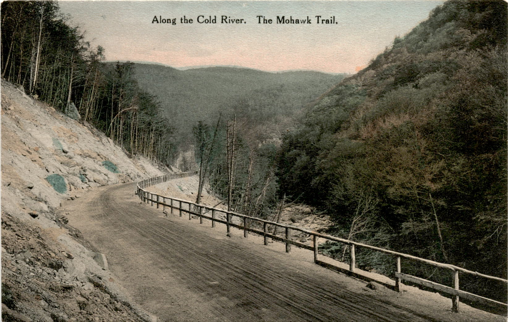 The postcard features a scenic view along the Cold River on the Mohawk Trail, part of the Mohawk Trail Series. The Albertype Co. in Brooklyn, NY, produced postcards of quality. The Mohawk Trail is a historic Native American footpath that now serves as a scenic drive through the Berkshire Mountains in Massachusetts. The Cold River is a tributary of the Deerfield River in the same region. The postcard likely dates back to a time when sending postcards was a popular form of communication and souvenir.