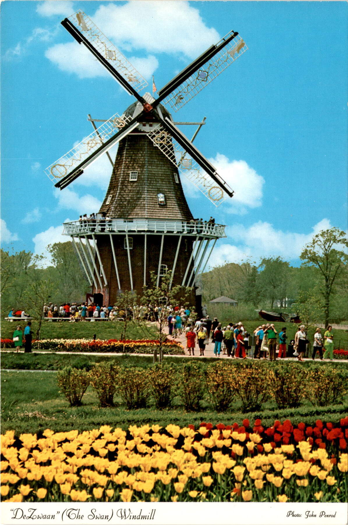 The postcard features a photo of De Zwaan (The Swan) Windmill located on Windmill Island in Holland, Michigan. The windmill is a historic and working mill, surrounded by beautifully landscaped grounds that bloom with tulips during the annual Tulip Festival in mid-May. The photo was taken by John Penrod. The windmill was originally built in the Netherlands in 1761 before being transported to the United States in 1964. It is the only authentic, working Dutch windmill in the United States.