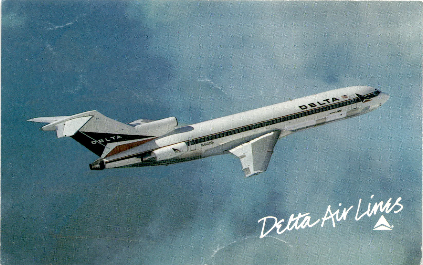 The postcard features a Delta Air Lines Boeing 727, known for its Wide-Ride™ comfort and range of over 1500 miles. The plane can accommodate 148 passengers, has a cruising speed of 530 mph, and is operated by a crew of three pilots and four flight attendants. Delta Air Lines is a major American airline known for its extensive domestic and international routes. The Boeing 727 was a popular medium-size jet in the airline industry, with a production run spanning from the 1960s to the 1980s.
