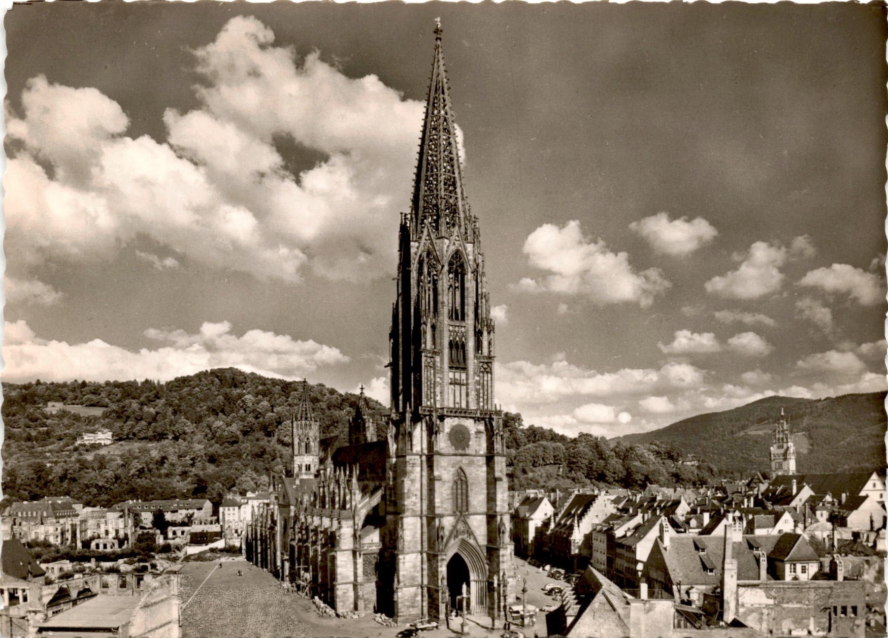 The postcard features a photo of Das Münster in Freiburg im Breisgau, located in the Black Forest region of Germany. The Münster, officially known as the Freiburg Minster, is a Gothic cathedral that dates back to the 13th century. It is one of the most iconic landmarks in Freiburg and is known for its stunning architecture, including intricate carvings and stained glass windows. The Münsterplatz, where the cathedral is located, is a bustling square in the heart of the city, surrounded by historic buildings and lively cafes.