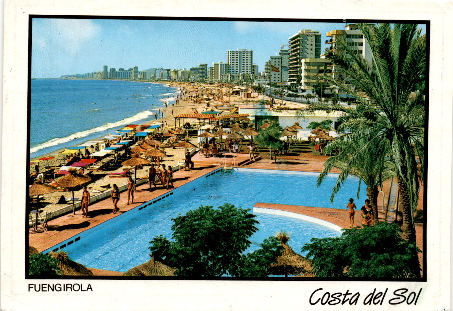 The postcard features a partial view of the beach in Fuengirola, a popular tourist destination on the Costa del Sol in Spain. The postcard is dated October 3, 1990, and mentions the travelers moving from Morocco to Spain. Fuengirola is known for its sandy beaches, vibrant nightlife, and the Bioparc Fuengirola zoo. The sender mentions the high number of tourists in the area, highlighting its popularity. The postcard is addressed to Miss June Hollmypworth in Pottstown, Pennsylvania, USA. The message expresses love and updates on the journey.