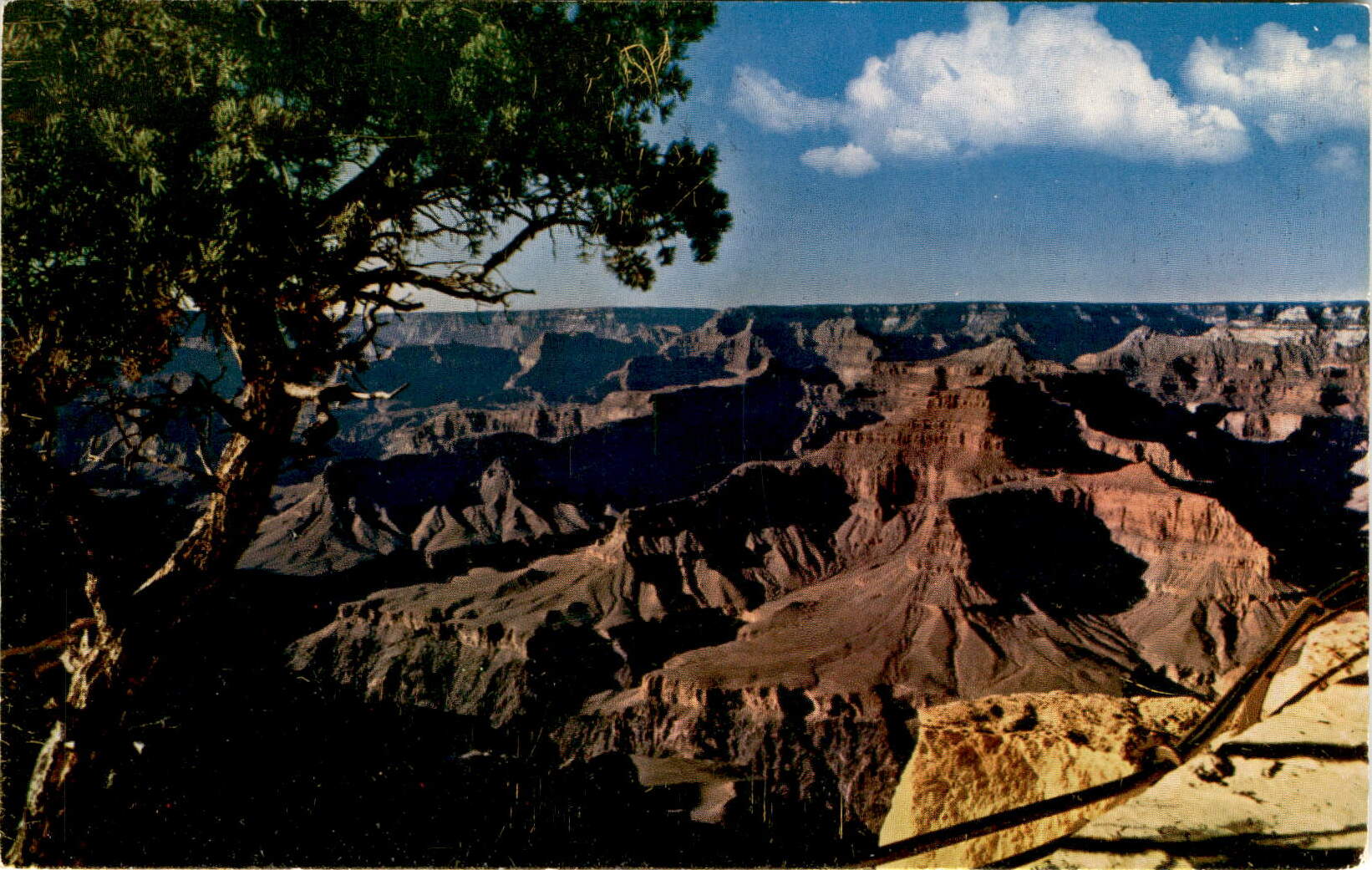 The postcard showcases the Grand Canyon National Park in Arizona, highlighting its massive ridges and deep chasms. The park is easily accessible by rail, plane, and modern highways, making it a popular tourist destination in the Western United States. The Grand Canyon is known for its stunning natural beauty, carved by the Colorado River over millions of years. It is one of the most iconic and visited national parks in the country, attracting millions of visitors each year to marvel at its breathtaking vistas and geological formations.