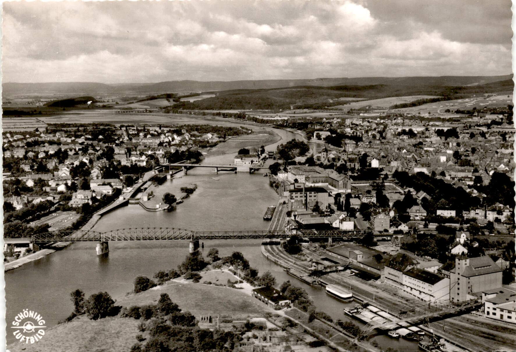 The postcard features a Luftbild (aerial photograph) of Hameln, a town located on the River Weser in Germany. The photograph was produced by Schöning & Co., a company based in Lübeck. The image is part of a series called SH Nr. 6147 and has the order number Hameln Flg 2394. The postcard is an authentic product from Schöning & Co. The town of Hameln is known for its medieval architecture, including the famous Pied Piper legend.