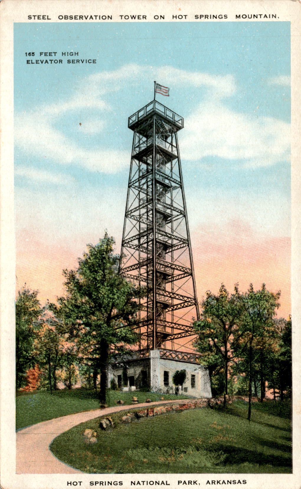 The postcard describes a steel observation tower on Hot Springs Mountain in Hot Springs National Park, Arkansas. The tower is 165 feet high and offers elevator service. It is located 815 feet above the city streets and is accessible by automobile, horseback, or walking along beautiful paths or graded roads. Hot Springs National Park is known for its thermal hot springs, which have been used for centuries for their healing properties. The park is also home to historic bathhouses, hiking trails, and scenic views.
