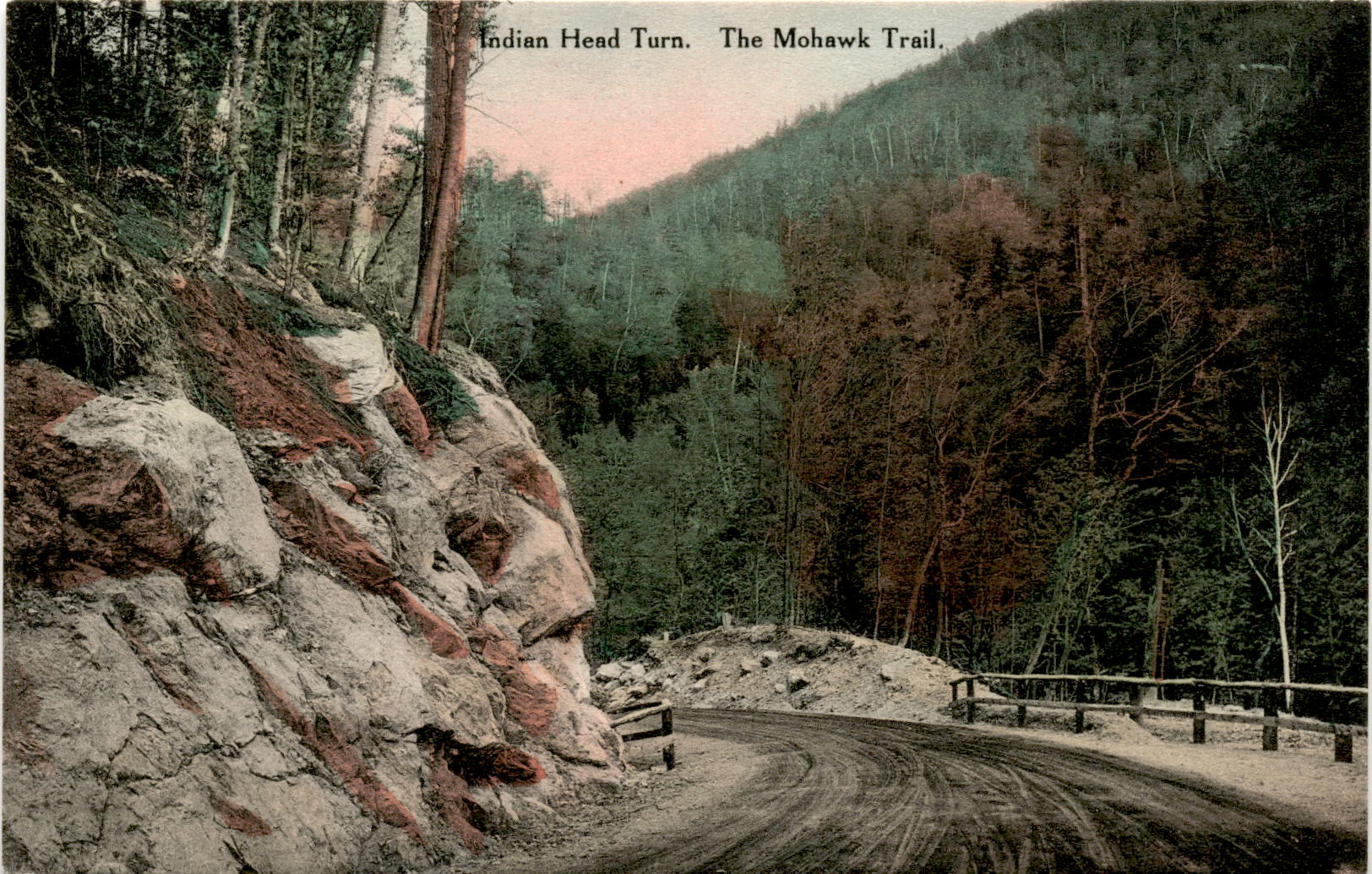 The postcard features an image of Indian Head Turn on the Mohawk Trail, part of the Mohawk Trail Series. The Mohawk Trail is a scenic drive in Massachusetts known for its beautiful views and historical significance. Indian Head Turn is a specific viewpoint along the trail that offers stunning vistas of the surrounding landscape. The postcard was produced by The Albertype Co. in Brooklyn, N.Y., known for creating high-quality postcards. The front of the postcard is reserved for the image, while the back has space for a message and address.