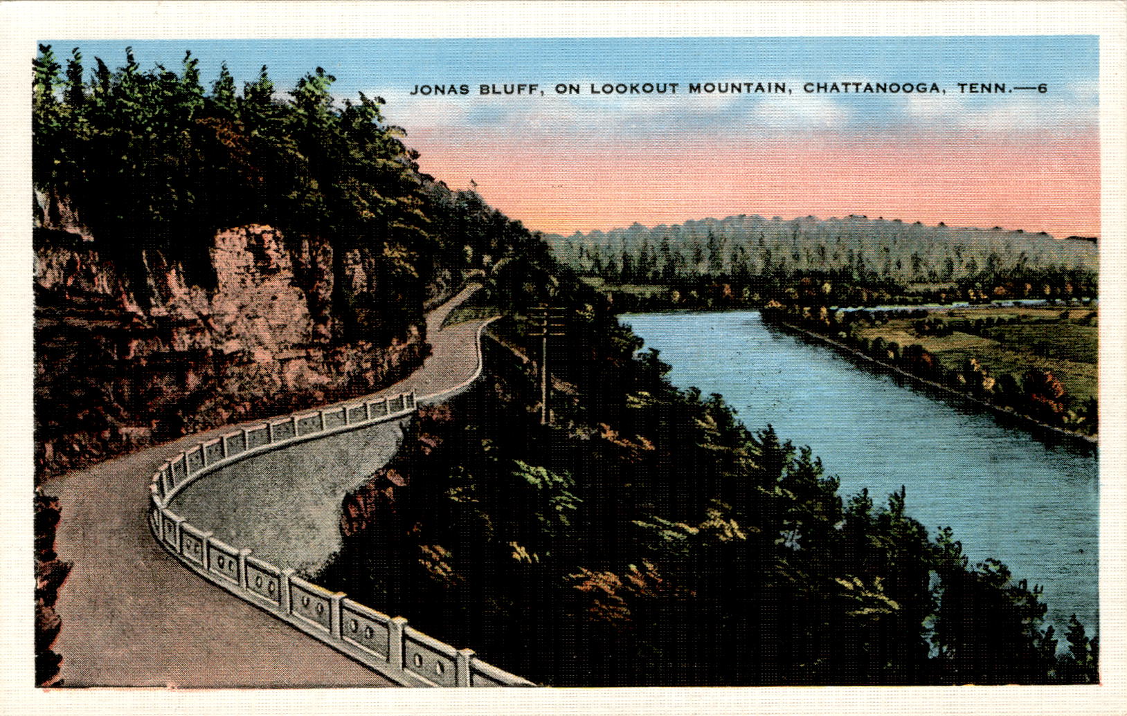 The postcard features Jonas Bluff on Lookout Mountain in Chattanooga, Tennessee, known for its stunning scenic views. Lookout Mountain is a prominent landmark offering panoramic vistas of the city and surrounding areas. Chattanooga is a city in southeastern Tennessee, known for its rich history, outdoor activities, and cultural attractions. The T. H. Payne Co. in Chattanooga published the postcard. Lookout Mountain is a popular tourist destination, offering attractions such as Rock City, Ruby Falls, and the Incline Railway. The area played a significant role in the Civil War, particularly during the Battle of Lookout Mountain.