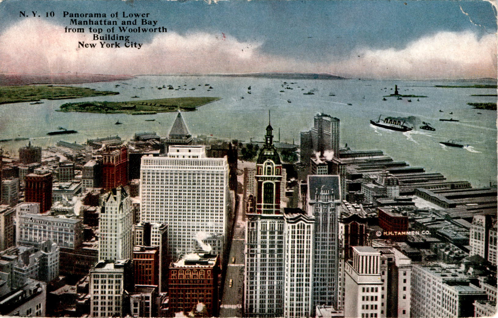 Back of PostcardThe front of the postcard features a panorama of Lower Manhattan and the bay from the top of the Woolworth Building in New York City. The image showcases the bustling transportation hub of lower Manhattan, with various methods of transportation passing through, including subways, cars, elevated railroads, and ferries. The Statue of Liberty is visible in the distance, along with Governor’s Island and Staten Island. The back of the postcard includes a message to Theresa, expressing excitement about the many things to see in New York City.