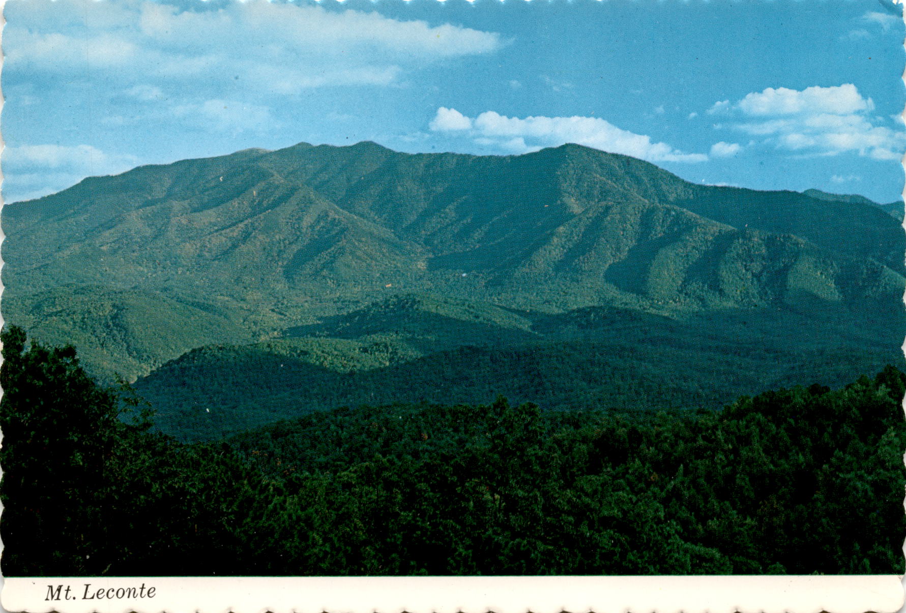 The postcard features a photograph of Mt. Le Conte, a prominent peak in the Great Smoky Mountains National Park, with an altitude of 6,593 feet. Known as the tallest peak in Eastern America, Mt. Le Conte is popular for hiking, with several trails leading to its summit. The postcard was photographed by Walter Cline and produced by W. M. Cline Co. in Gatlinburg, Tennessee. Mt. Le Conte is a favorite destination for hikers and nature enthusiasts due to its stunning views and challenging trails.