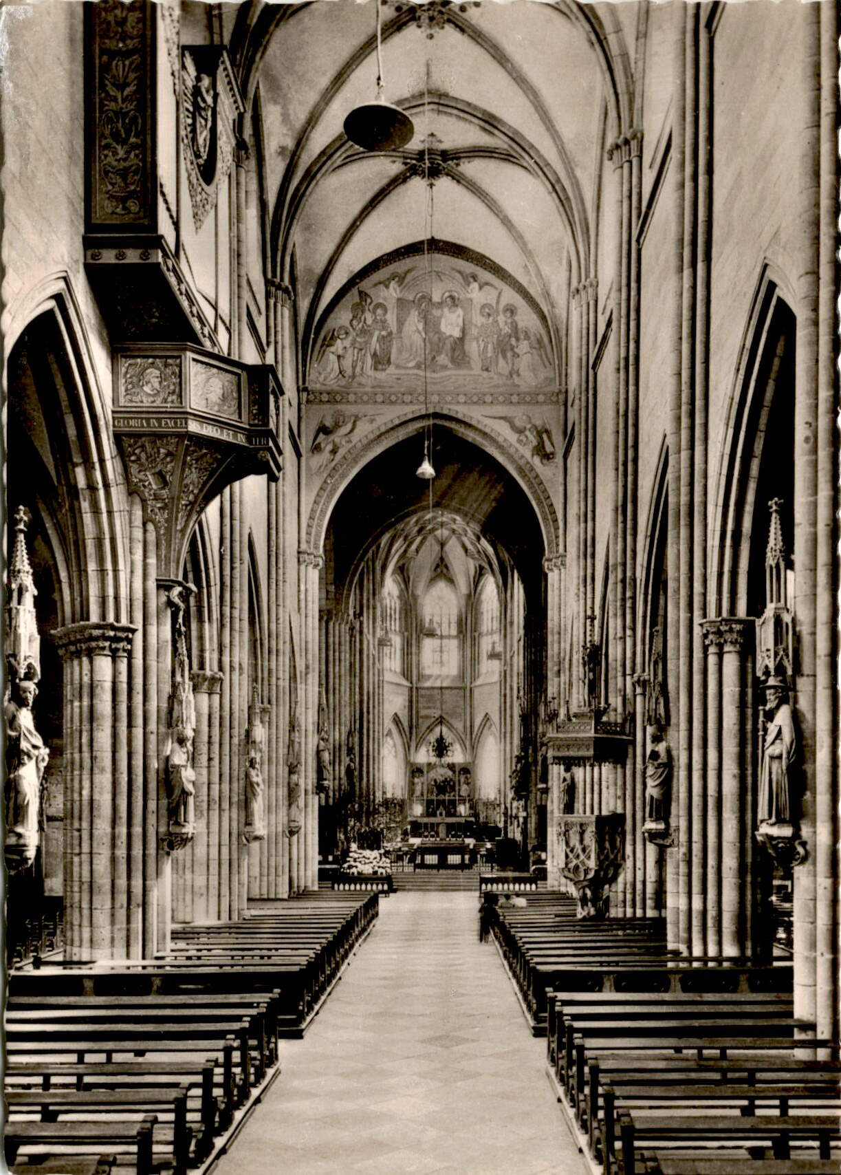 Back of PostcardThe postcard features a photo of the interior of the Münster Cathedral in Freiburg im Breisgau, Germany. The Münster is a Gothic cathedral known for its stunning architecture, including intricate stained glass windows and ornate decorations. The phrase Gloria in Excelsis Deo is a Latin hymn praising God. The postcard was taken by Photo Baumgartner, a photographer based in Freiburg. The address on the postcard is Münsterplatz 18, which is the square where the cathedral is located.