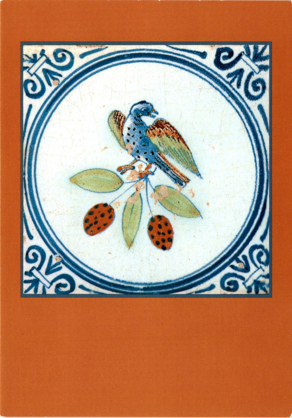 The postcard features a ceramic tile from the 17th century, depicting a bird in a circle. This artwork is attributed to the Dutch school and is housed in the Museum Huis Lambert van Meerten in Delft. Additionally, the postcard mentions UNICEF, the United Nations Children’s Fund, which works worldwide to provide humanitarian aid and development assistance to children and mothers in need. The postcard was printed in Canada.