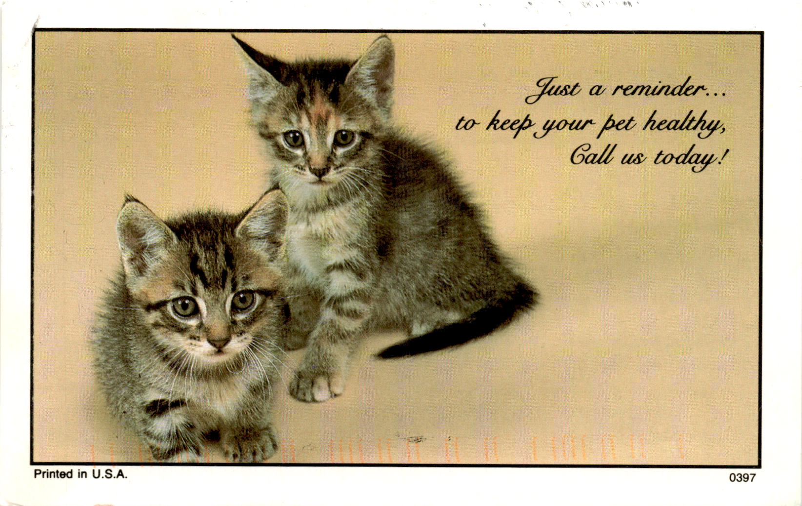 Back of PostcardThe postcard is a reminder from the North Concho Vet Clinic in San Angelo, Texas, to Mr. & Mrs. Wilford Deaton about their pet Prissy. It indicates that Prissy is due for various vaccinations and a physical examination. The clinic recommends annual vaccinations, including rabies, FIP, and leukemia. They also suggest a fecal check and request the owners to contact them to schedule an appointment for their pet’s health check-up. The postcard was printed in the USA in December 1997.