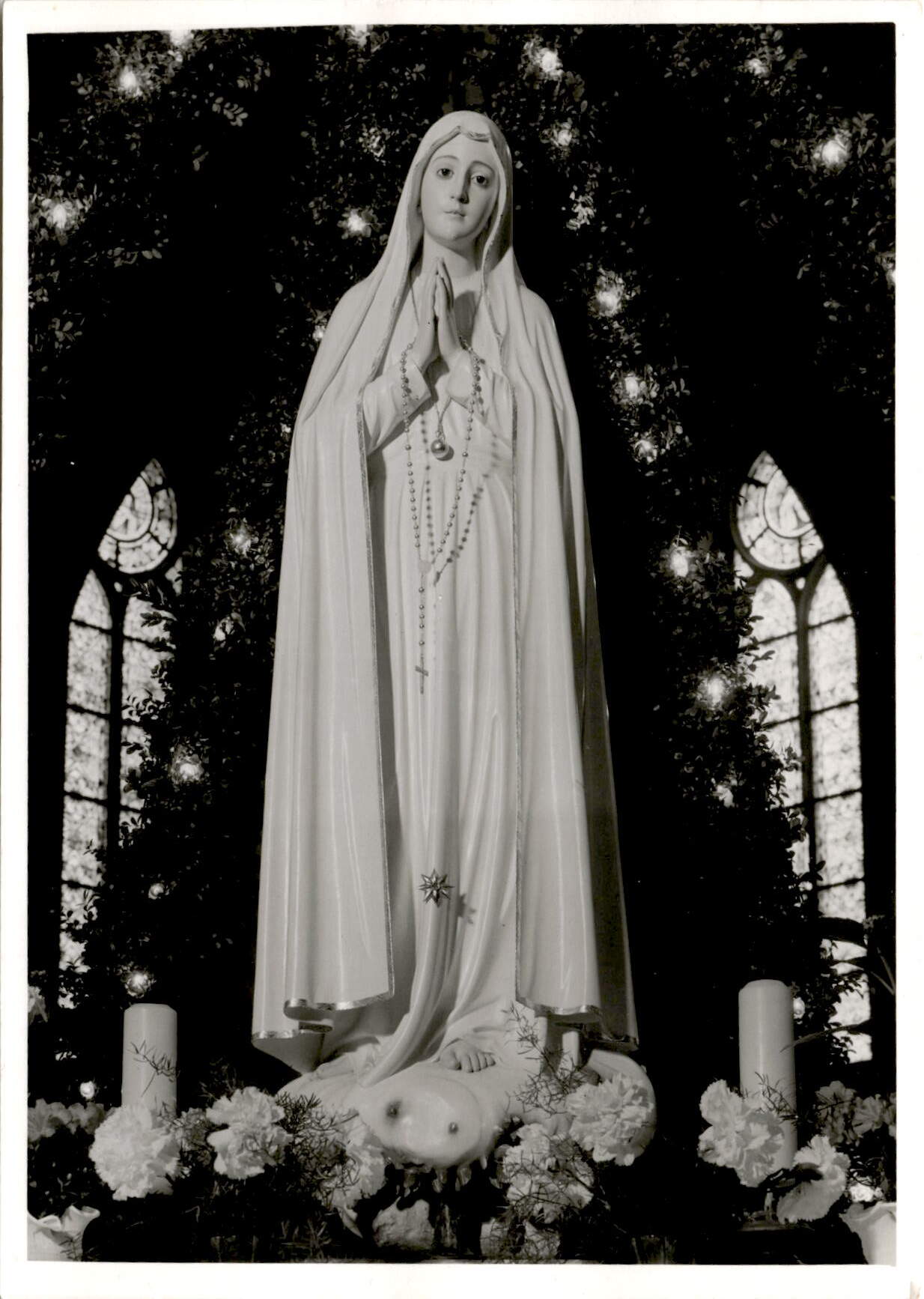 The postcard features an image of the Pilgrim Virgin of Fatima during her visit to the Kartause Hain in Düsseldorf-Unterrath, captured by the State Land Image Agency of Niederrhein in Düsseldorf. The Pilgrim Virgin of Fatima refers to a statue of the Virgin Mary associated with the Marian apparitions in Fatima, Portugal, in 1917. The Kartause Hain is a Carthusian monastery located in Düsseldorf-Unterrath, known for its historical significance and architectural beauty.