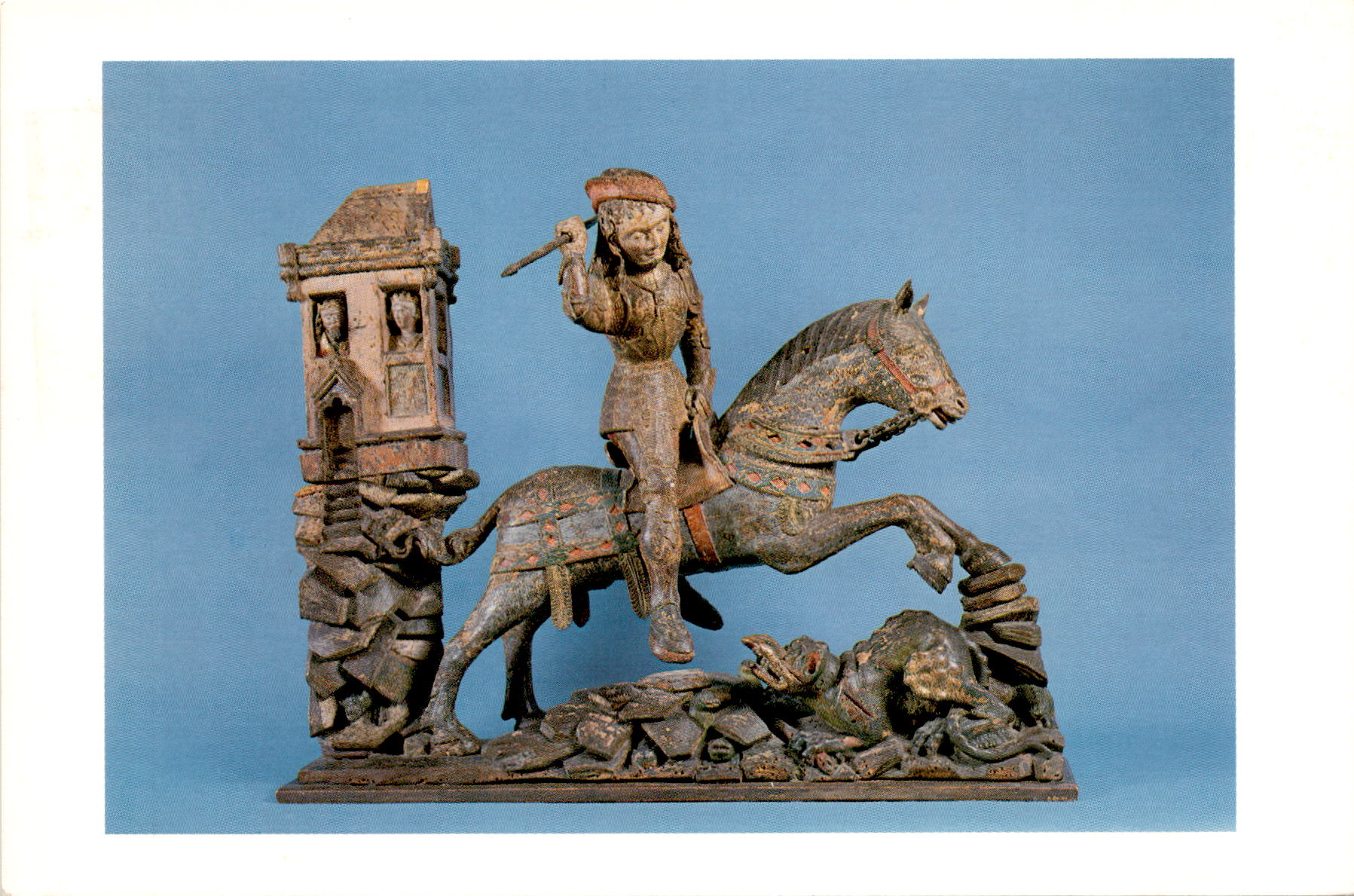 The postcard features a 16th-century German or Netherlandish sculpture of St. George and the Dragon, made of wood with traces of polychrome and gilt. It is part of the Dr. and Mrs. Frederic G. Oppenheimer Collection at the McNay Art Museum in San Antonio, Texas. The museum is renowned for its collection of European and American art, including works by modern masters like Picasso and O’Keeffe. St. George is a popular Christian martyr and patron saint, often depicted slaying a dragon, symbolizing the triumph of good over evil.
