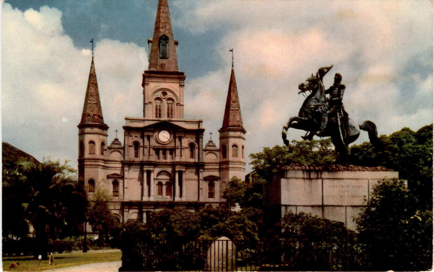 The postcard features the St. Louis Cathedral and General Jackson Memorial in New Orleans, Louisiana. The cathedral, built in 1794, is a prominent landmark in North America. The General Jackson Memorial, unveiled in 1856, is notable for its balanced sculpture where the entire weight of the statue rests on the hind legs of the horse. The postcard showcases these historic and artistic elements, highlighting the rich cultural and architectural heritage of New Orleans. The color illustration is by Grant Robertson and the card is produced by H. S. Crocker Co., Inc. in San Francisco.