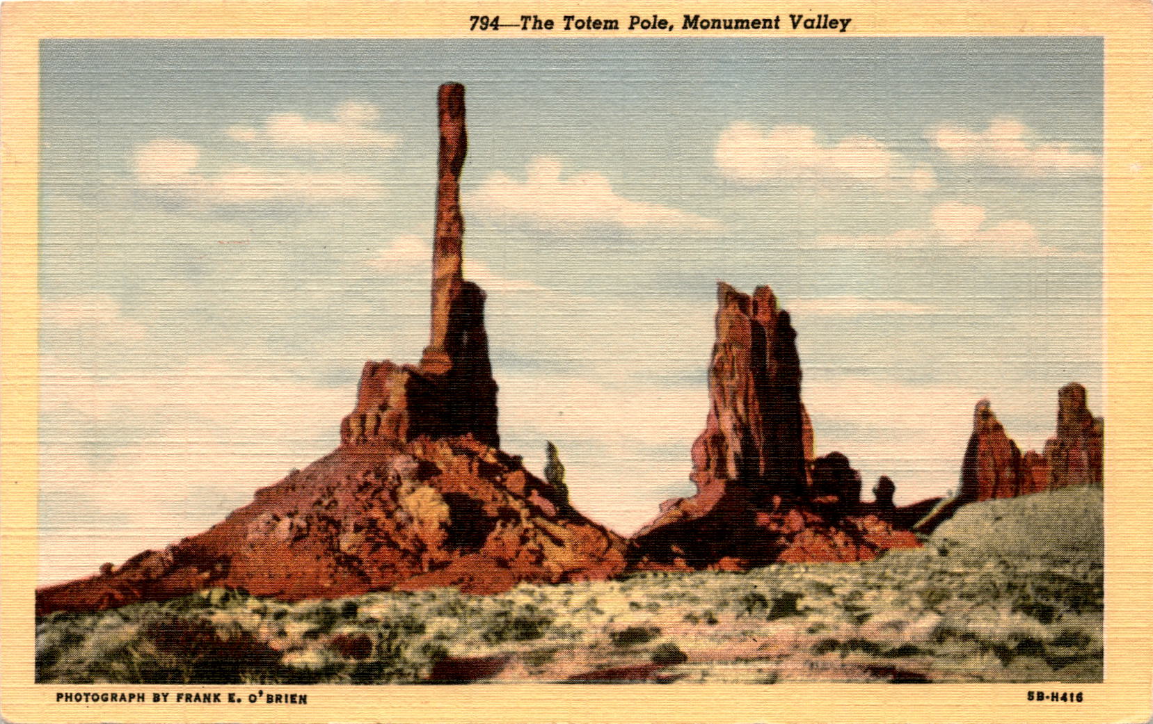 Back of PostcardThe postcard features a photograph of the Totem Pole in Monument Valley, located in Southeastern Utah near the Arizona border. Monument Valley is known for its stunning red desert landscape with towering rock formations. The Totem Pole is a prominent monolith that rises 12,000 feet high and casts a shadow across the desert that stretches for thirty-five miles. The area is popular for its unique geological features, including mesas, buttes, and spires, attracting visitors for its scenic beauty and cultural significance to the Navajo Nation.