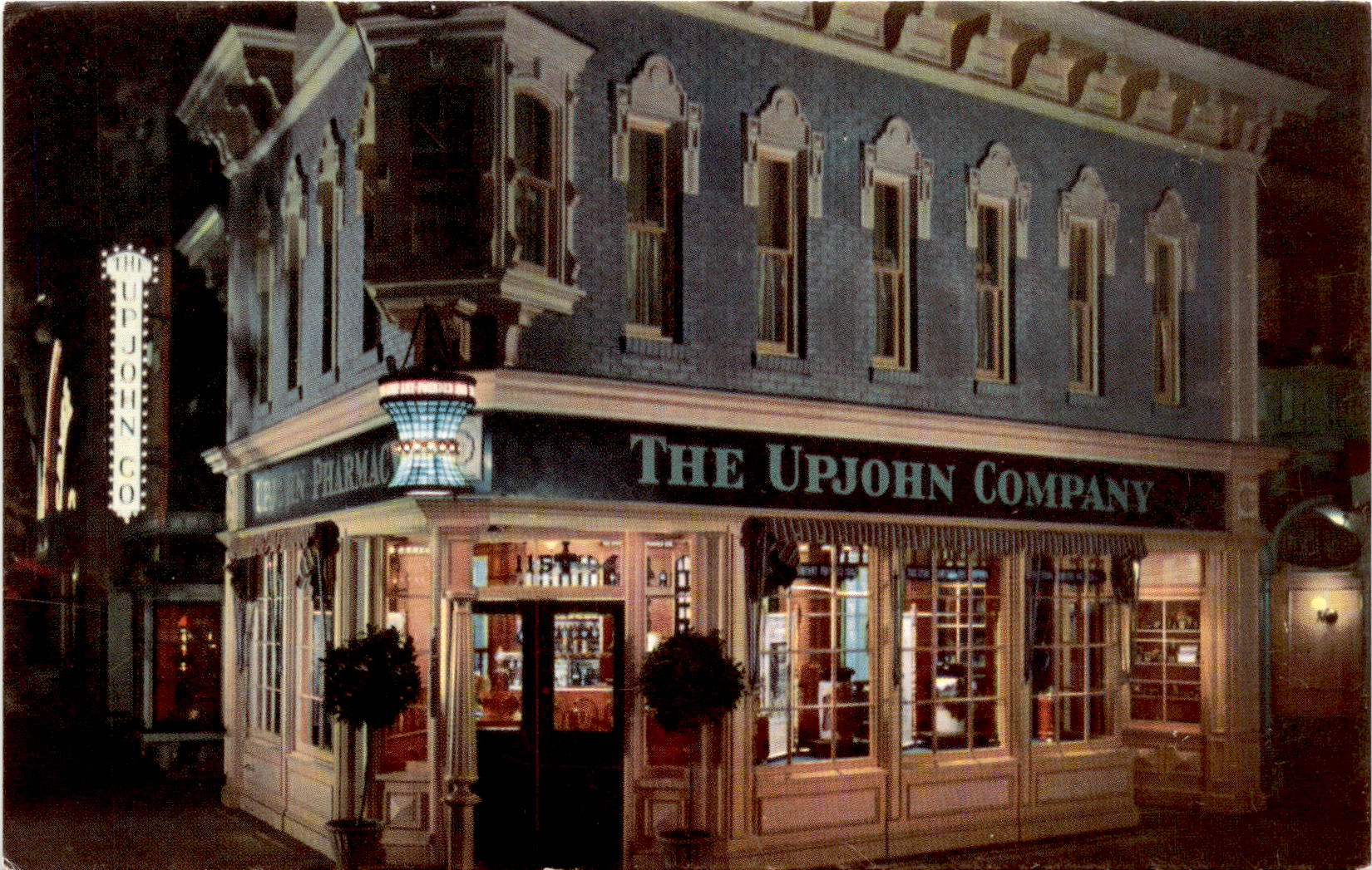 The postcard features an image of The Upjohn Company’s drugstore in Disneyland, showcasing over 1000 pharmaceutical antiques in a Victorian setting. The Upjohn Company, based in Kalamazoo, Michigan, is known for its history in the pharmaceutical industry, designing and producing medicines with care. The establishment includes a giant mortar above the entrance, adding to its old-fashioned charm. This postcard serves as a nostalgic reminder of the company’s legacy and its contribution to the field of medicine.
