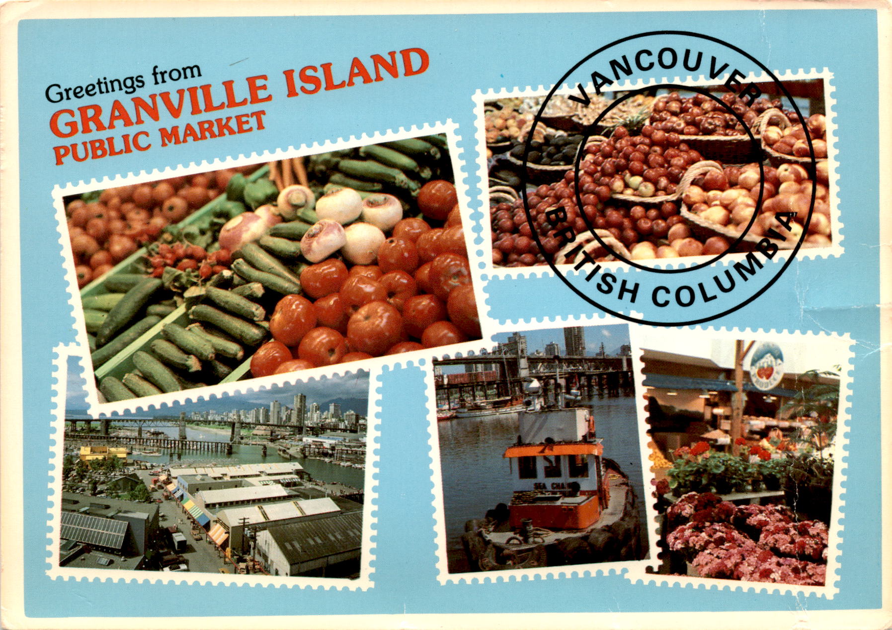 This postcard is a postcard from Granville Island Public Market in Vancouver, British Columbia. It mentions the location of the market under the Granville Street Bridge, offering fresh produce, fish, seafood, meats, groceries, and plants. The postcard includes a photo credit to Don Ceppi and mentions Natural Color Productions Ltd. in Richmond, B.C.