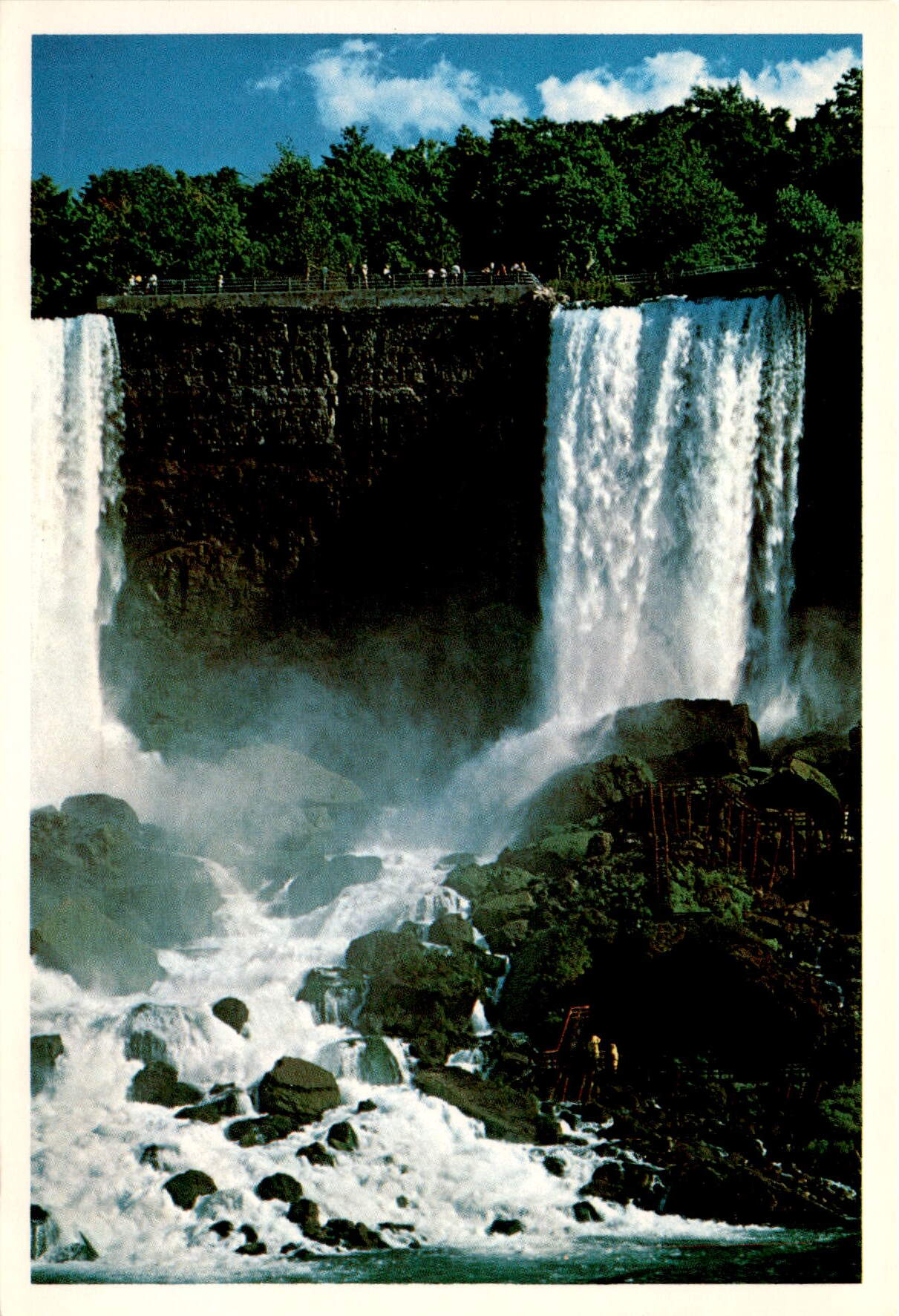 This postcard is a description of a postcard featuring Niagara Falls, New York. It mentions the Cave of the Winds trip, which allows visitors to have a close-up view of the American Falls and the Bridal Veil. The postcard is copyrighted by Travelpix and was made by Dexter Color Canada in Cornwall, Ontario.