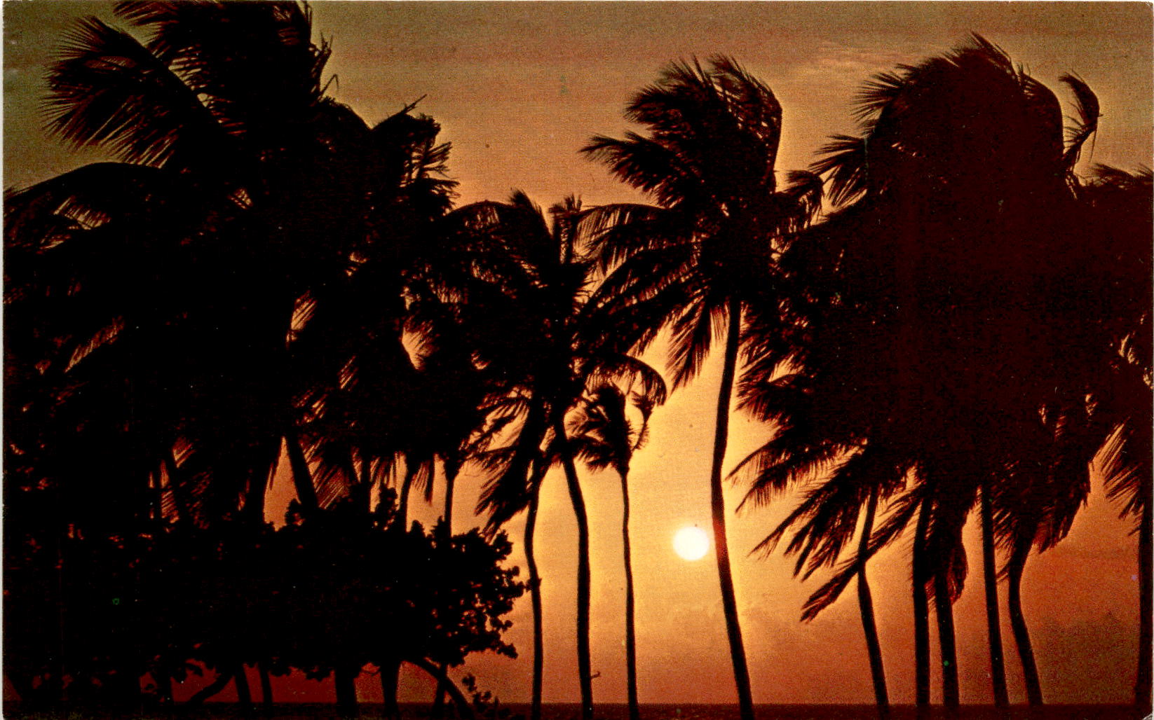 This postcard is a description of a color photo of a sunrise in Florida taken by Joe Posner. It also includes information about the publisher, Roppel Color Cards based in Hawthorne, New Jersey, and Florida Natural Color, Inc. in Miami, Florida.