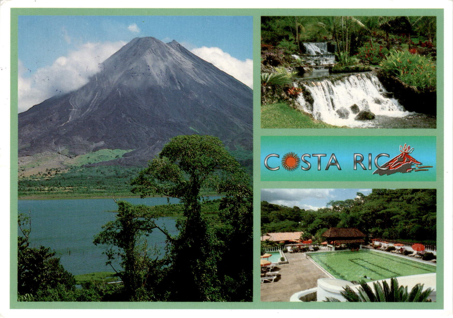 The postcard is from someone in Costa Rica, dated January 26, 2000. The sender mentions their visit to the Volcán Arenal and Balneario Tabacón, with a photo by Thomas Leifeld.