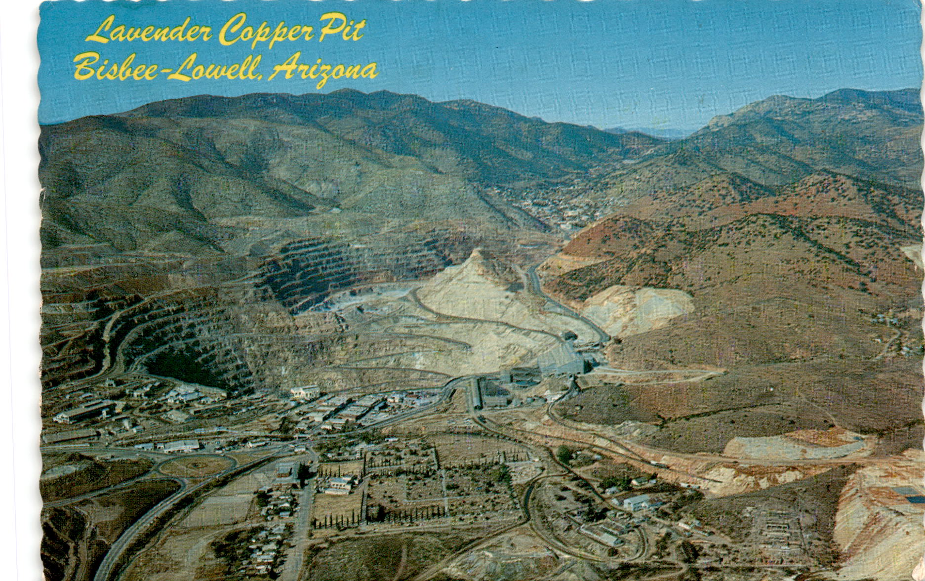 This postcard showcases the Lavender Open-Pit Copper Mining Operation in Bisbee-Lowell, Arizona, which was owned by Phelps Dodge. The unique aspect of this operation is that the pit was being dug in the area where in 1953, U.S. Highway 80 was located, surrounded by business houses and homes of the two cities, Bisbee and Lowell.