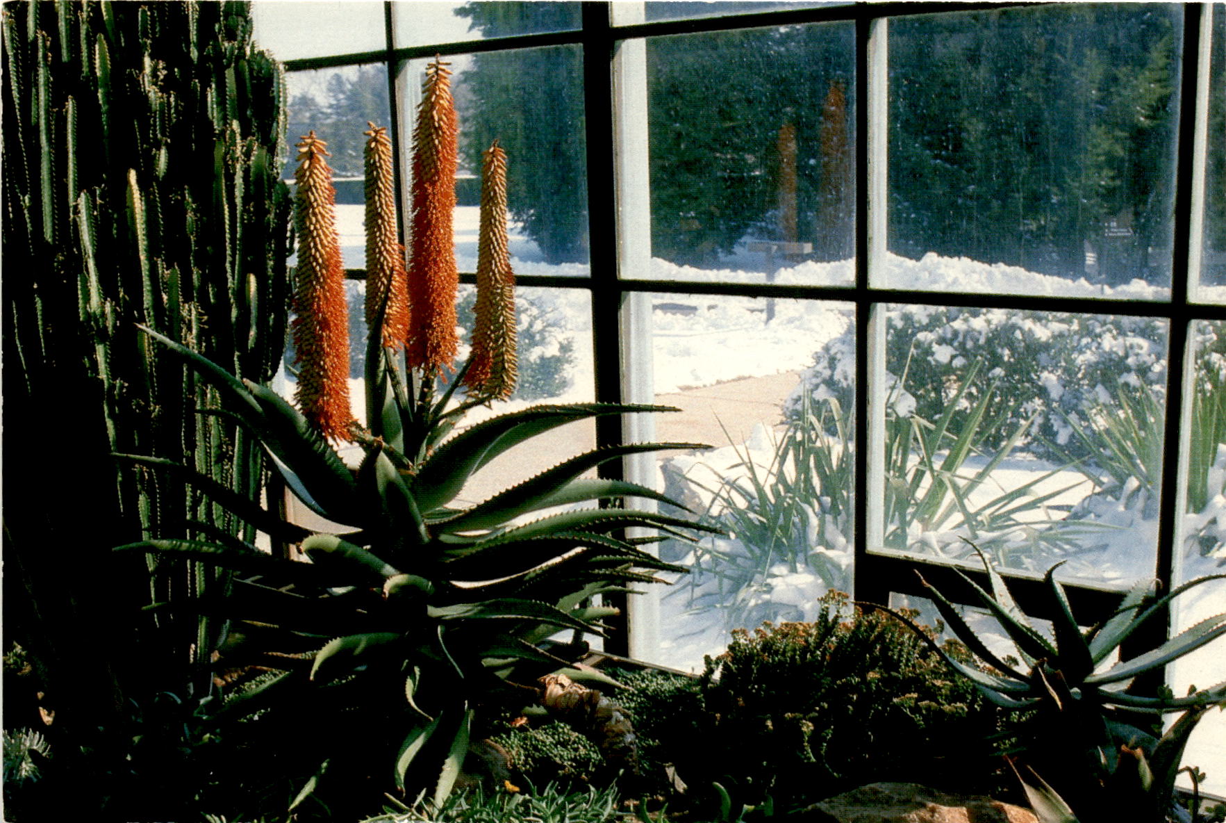 The postcard features an image of a succulent aloe plant (Aloe ferox) blooming indoors at Longwood Gardens in Kennett Square, Pennsylvania. Longwood Gardens is a historic botanical garden spanning over 1,000 acres with a diverse collection of plants, trees, and flowers. The gardens were created by Pierre S.