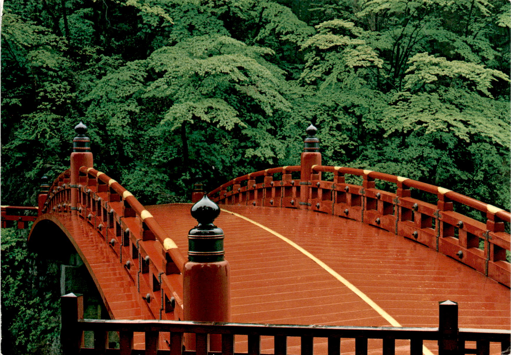 The postcard features the Shinkyo, also known as the Divine Bridge, located in Nikko, Japan. This iconic red lacquered bridge gracefully arches over the Diya River and was originally constructed in 1636 for the exclusive use of Imperial and Shogun messengers.