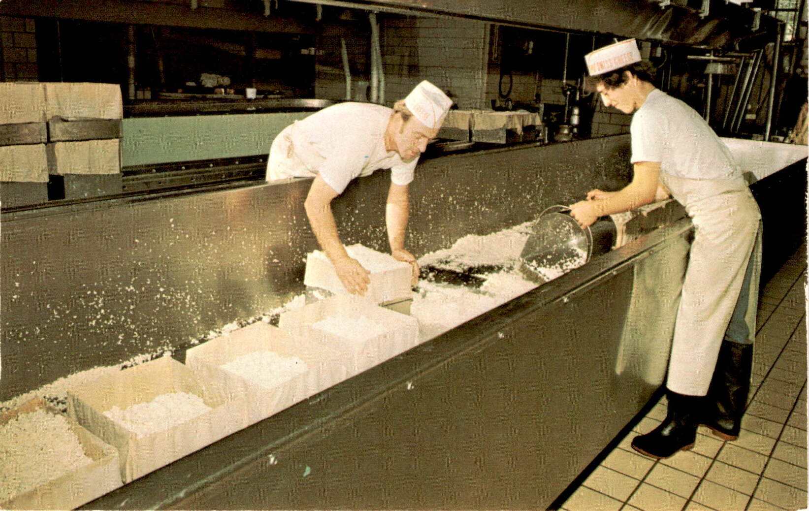 The postcard features an image of cheese production at Alpine-Alpa, a renowned cheesemaking facility located in Wilmot, Ohio. Alpine-Alpa is known as Ohio’s Showplace of Cheesemaking and produces 15 varieties of cheese, including the Alpa-Horn Cheese depicted in the image.