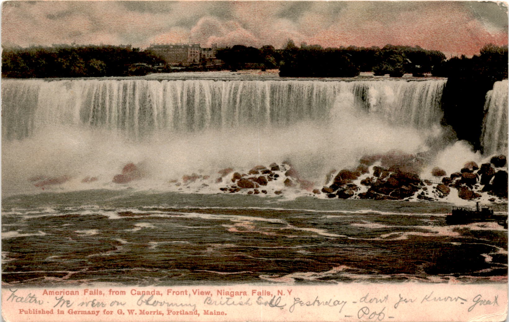 The postcard features a view of American Falls from Canada, with Niagara Falls, New York in the background. It includes a British stamp and was published in Germany for G. W. Morris in Portland, Maine in 1901. The postcard seems to reference a visit to a place called Bloommy Collegesterday and mentions a goat.