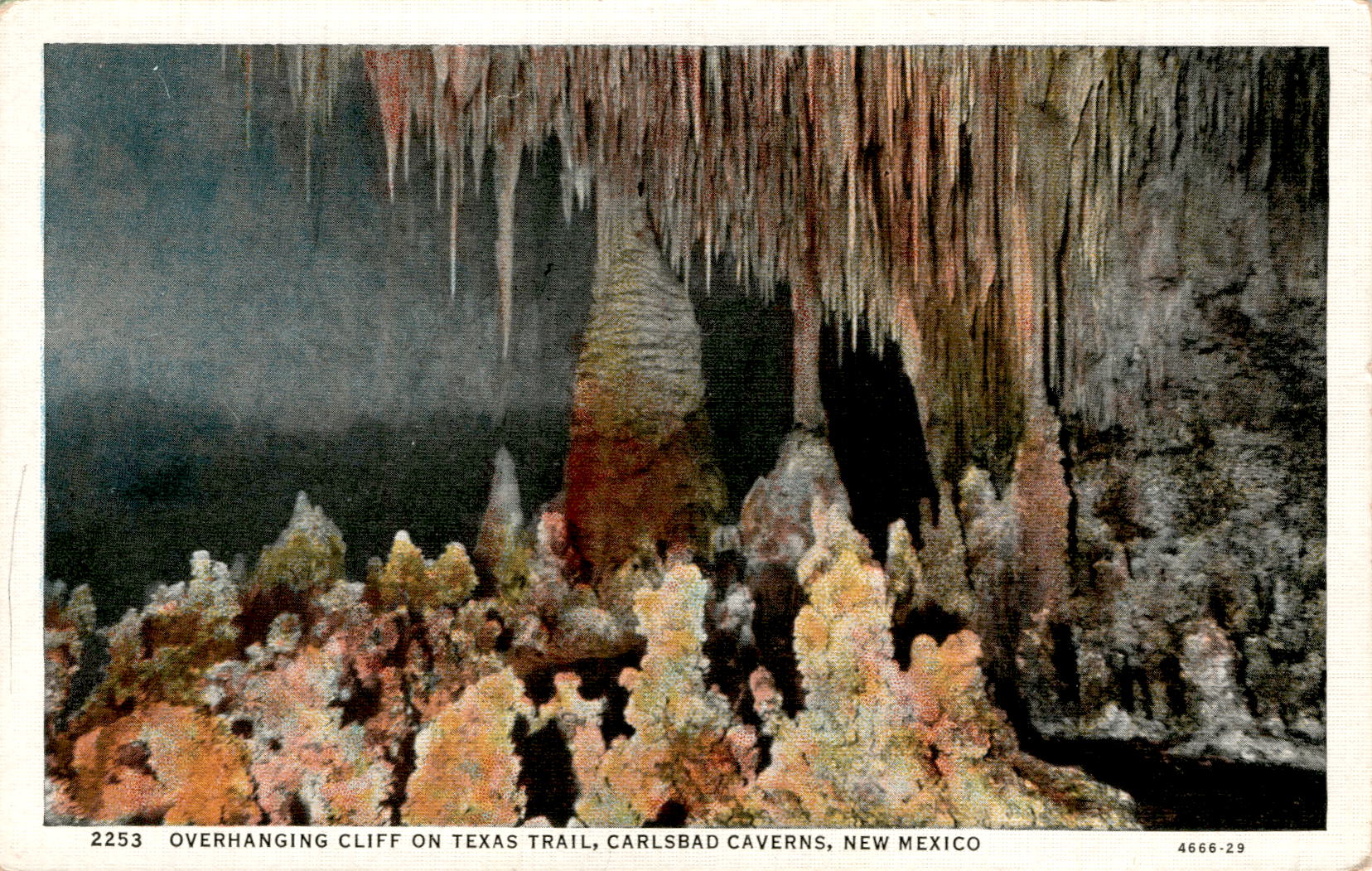 The postcard depicts an overhanging cliff on the Texas Trail at Carlsbad Caverns in New Mexico. Carlsbad Caverns is a famous national park known for its extensive cave system, including the Big Room, a large limestone chamber. The park offers opportunities for cave tours, hiking, and wildlife viewing.
