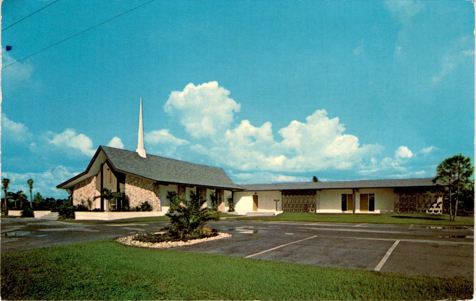 The postcard is from the Covenant Presbyterian Church located on Tamiami Trail North at Myrtle Drive in Naples, Florida. The church is part of the Reformed Presbyterian Church, Evangelical Synod. The pastors are P. Robert Palmer and Kenneth W. Bruce.