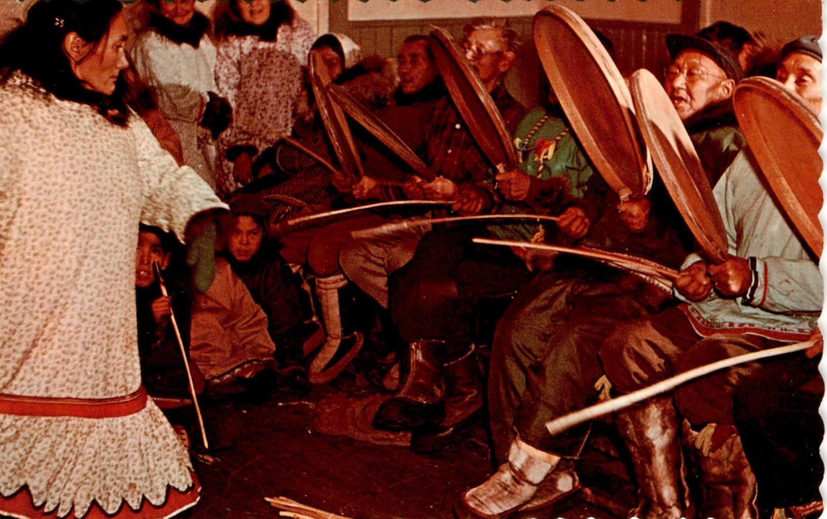 The postcard features an Eskimo Dance performed by Eskimo residents of Canada’s Arctic wilderness. These traditional dances are a form of storytelling that date back to ancient Eskimo culture. The photo was taken by Carey and published by J. H. Bell in Edmonton, Alberta. The postcard was made in Canada by Dexter Color, Ltd. in Cornwall, Ontario.