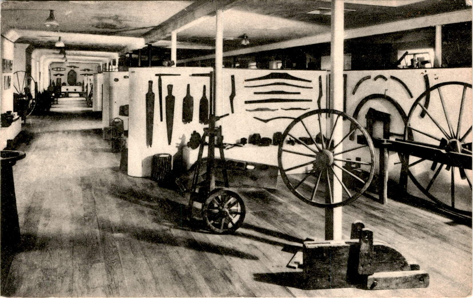 The postcard features a view of the Wheelwright Shop at The Farmers’ Museum in Cooperstown, New York. The museum is dedicated to preserving rural heritage and showcasing the history of agriculture in America. The Wheelwright Shop likely displays traditional tools and techniques used in wheel-making, an important skill in the agricultural industry.
