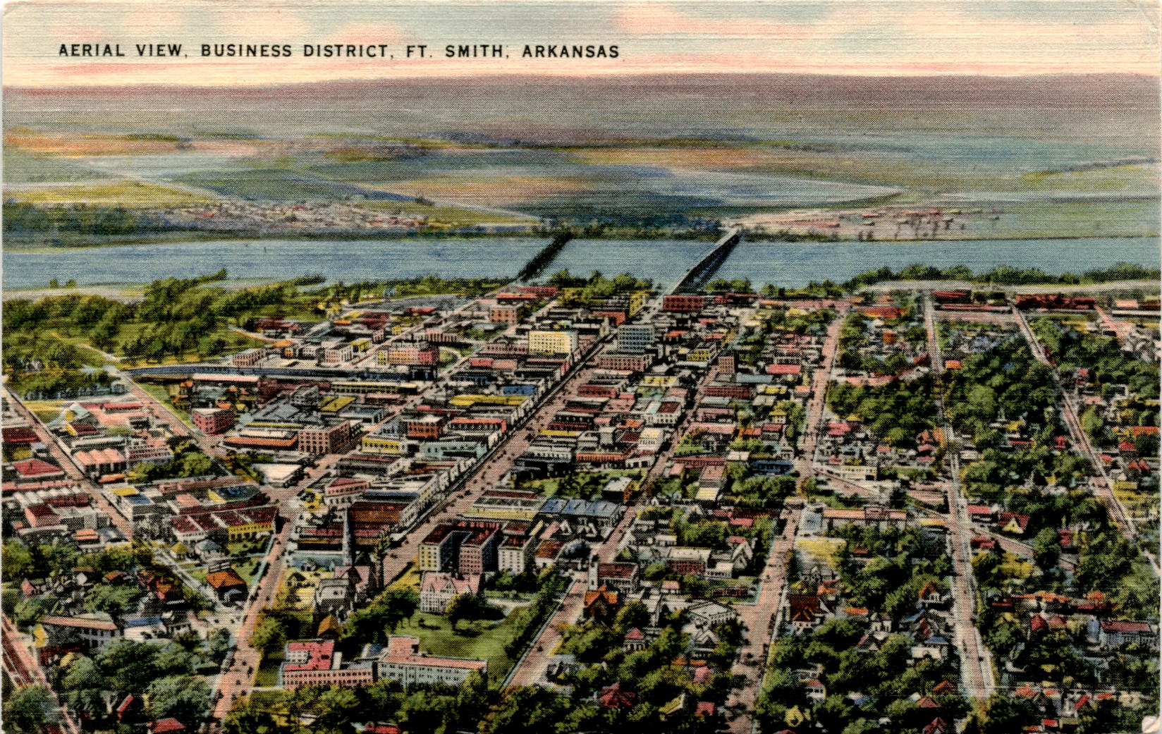 The postcard features an aerial view of the business district in Fort Smith, Arkansas. Fort Smith is a city located in the northwest region of the state of Arkansas. The business district likely includes various commercial and financial establishments, showcasing the economic hub of the city.