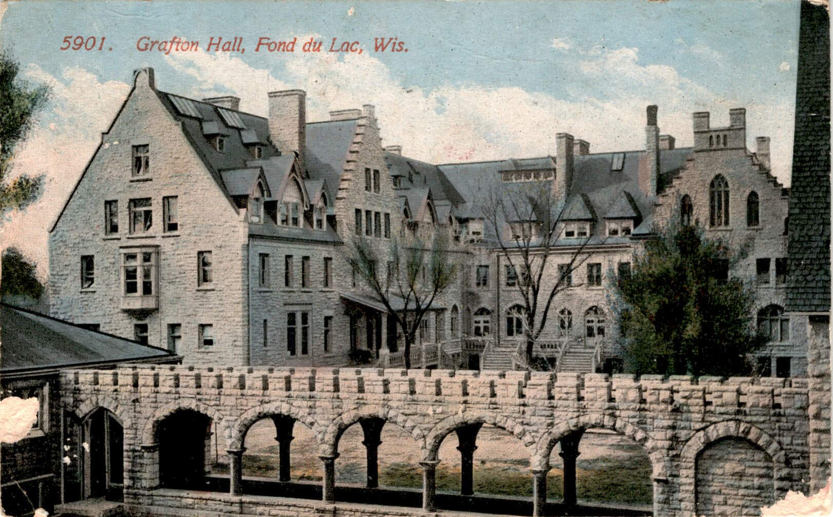 The postcard is from Grafton Hall in Fond du Lac, Wisconsin, dated 1914. The front of the postcard features an image of the hall. The back of the postcard includes a message from someone named Georg Wight to Mrs. Eather Affil in Nailsrille, R.R. No. 2.