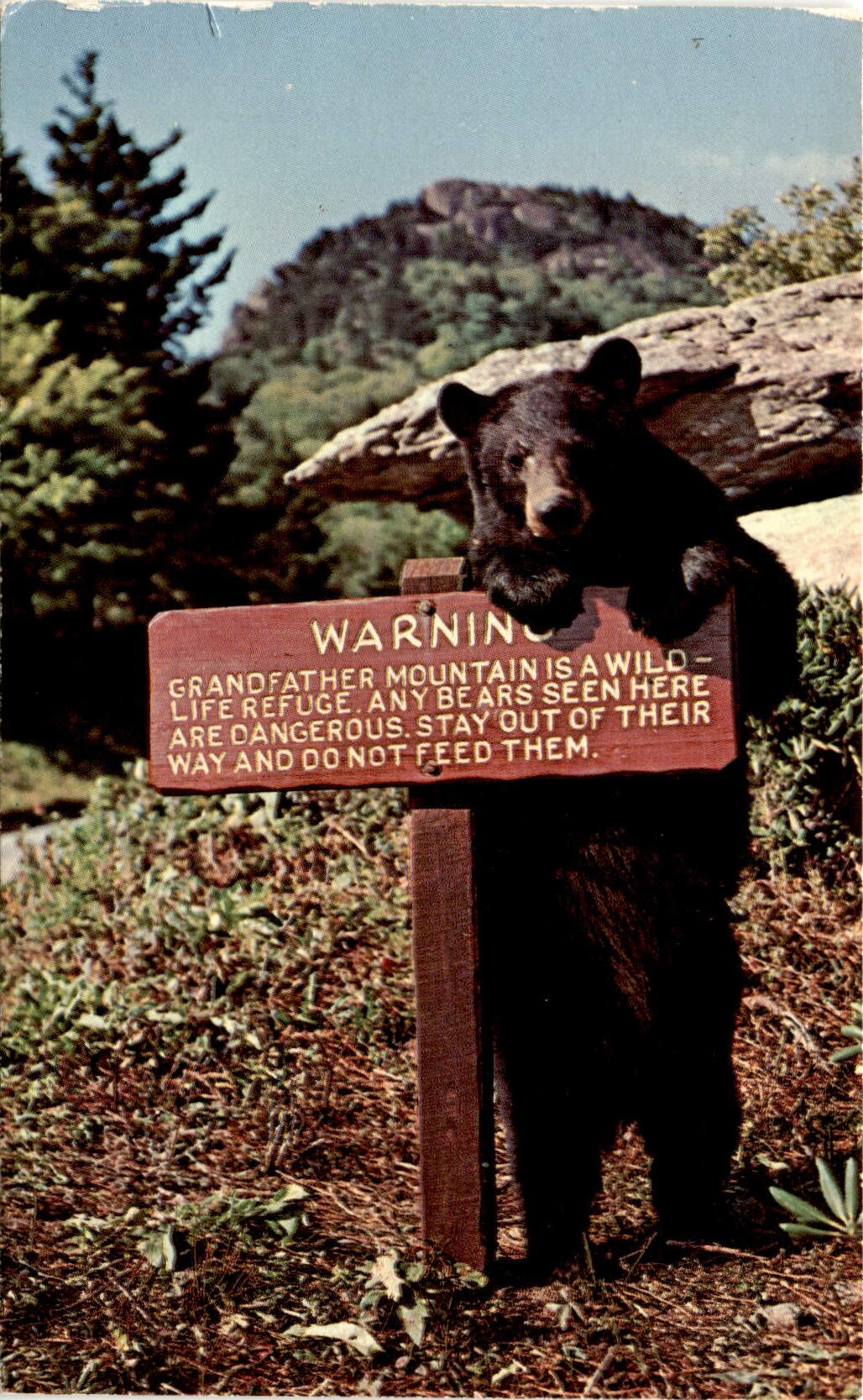 The postcard is a warning about the presence of dangerous bears in Grandfather Mountain, North Carolina, which is a wildlife refuge. The card mentions a somewhat tame wild bear named Mildred, urging visitors to stay out of the bears’ way and not to feed them. The sender of the postcard mentions being on the lookout for Mildred but not seeing her.