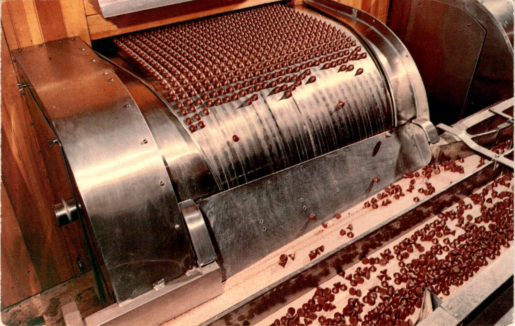 Back of PostcardThe postcard features Hershey, Pennsylvania, known as Chocolate Town, U.S.A. The image shows Hershey’s Kisses being produced at The Hershey Chocolate & Confectionery Division Plant of Hershey Foods Corporation.
