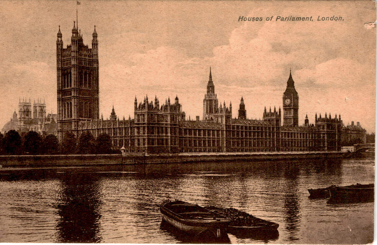 Back of PostcardThe postcard features an image of the Houses of Parliament in London. The front of the postcard includes a view of the iconic building, while the back contains instructions for postage and correspondence. The recipient of the postcard is addressed as Mr. Kamtan, and the sender’s name is Myna Lackmond from New York City, U.S.A.