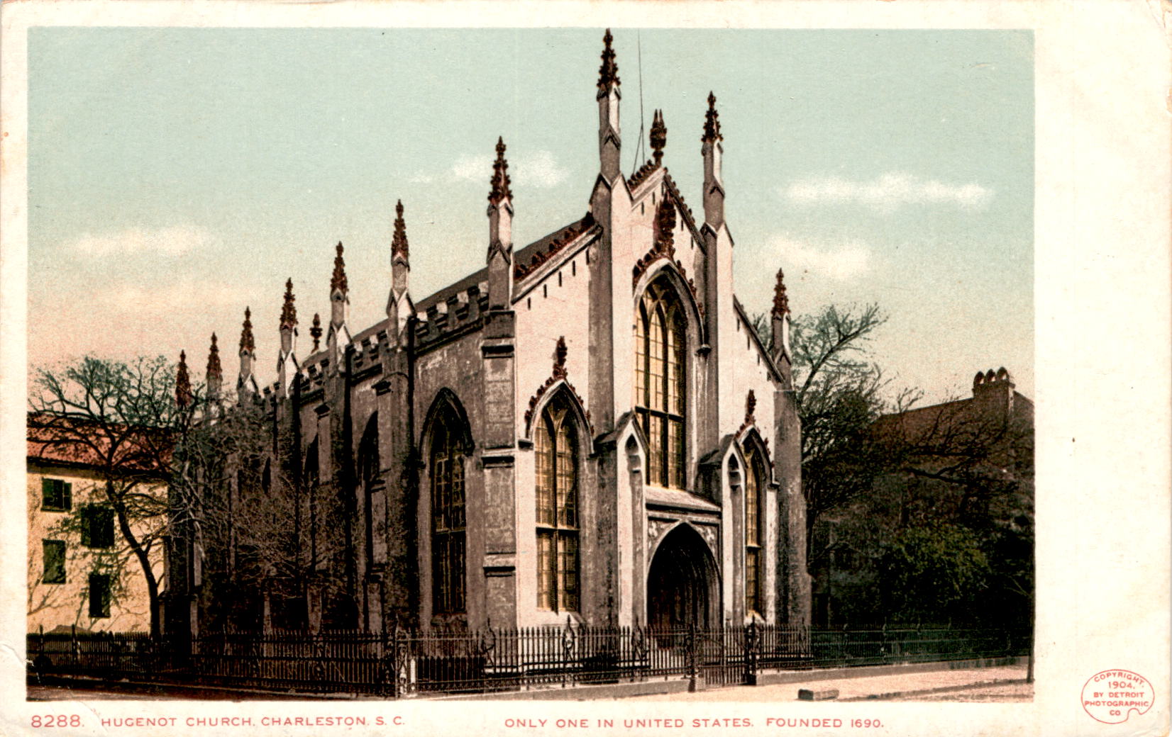 The front of the postcard features an image of the Huguenot Church in Charleston, South Carolina. The church is noted as the only Huguenot church in the United States and was founded in 1690. The postcard is copyrighted by the Detroit Photographic Company.