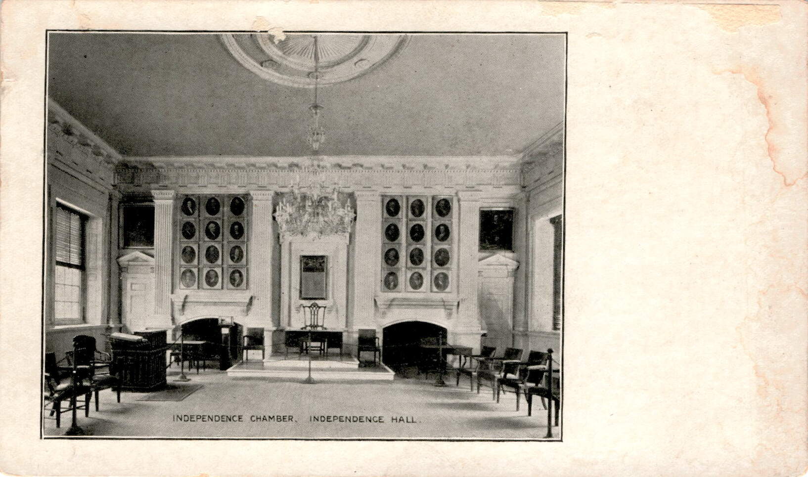 The postcard mentions the Independence Chamber and Independence Hall. Independence Hall is located in Philadelphia, Pennsylvania, and is a historic building where the Declaration of Independence and the United States Constitution were debated and adopted. It is now part of Independence National Historical Park and is a UNESCO World Heritage Site.