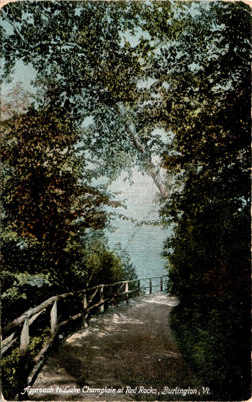 The postcard depicts the approach to Lake Champlain at Red Rocks in Burlington, Vermont. Lake Champlain is a natural freshwater lake located in North America, primarily in the states of Vermont and New York. It is the sixth-largest lake in the United States and a popular destination for outdoor activities such as boating, fishing, and hiking.