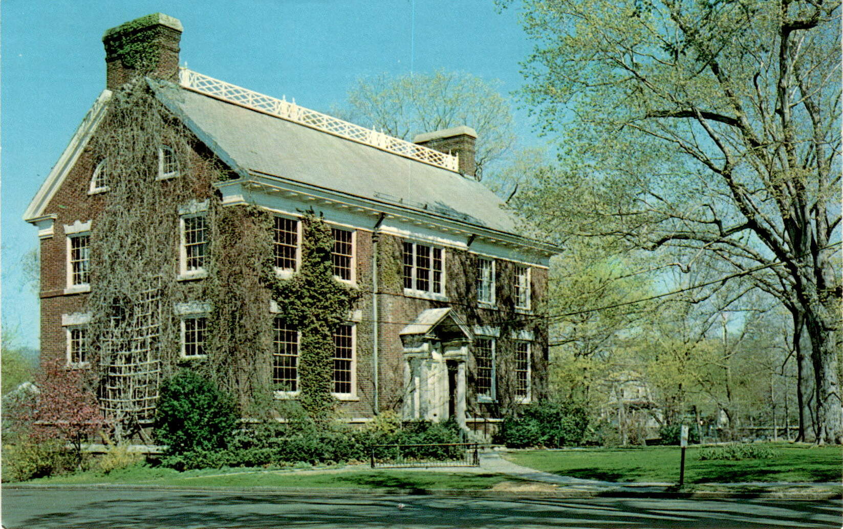 This postcard features an image of the library located at Purchase Street & Library Lane in Rye, New York, in Westchester County. The postcard was produced by Pendor Natural Color, based in Pearl River, New York. The printing was done by Dexter Press, Inc. in West Nyack, New York.