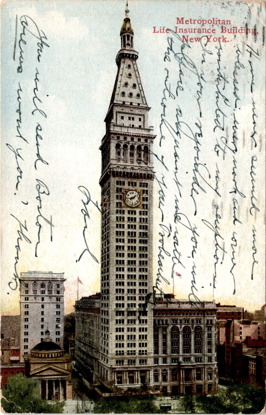 The postcard mentions the Metropolitan Life Insurance Building, a notable structure in New York City. The building was completed in 1909 and was the world’s tallest building until 1913. It is known for its distinctive clock tower and ornate architecture.