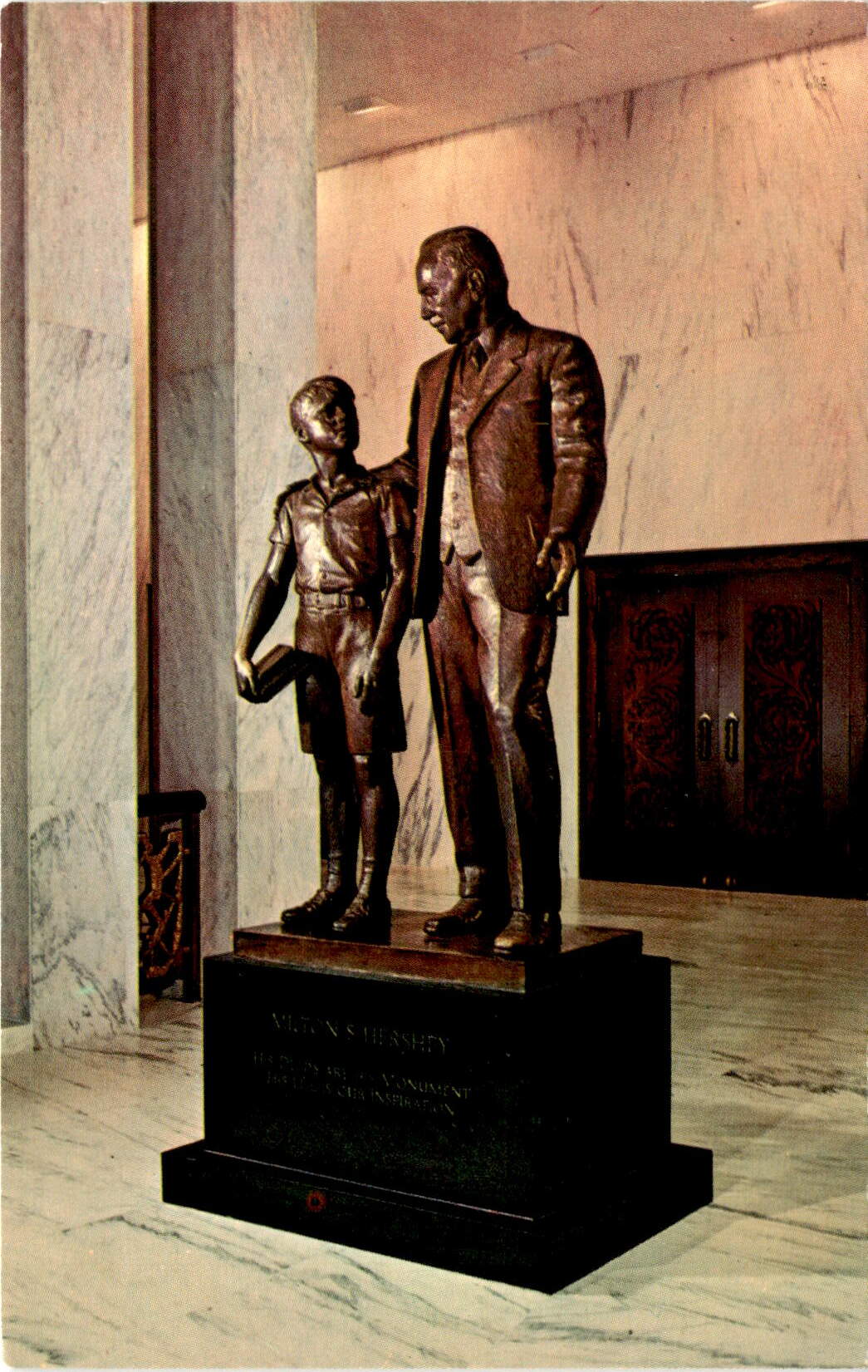 The postcard features a statue of Milton S. Hershey at the Milton Hershey School in Hershey, Pennsylvania, also known as Chocolate Town, U.S.A. The statue, created by sculptor Walker Hancock, depicts Milton Hershey with his arm around the shoulder of a boy.